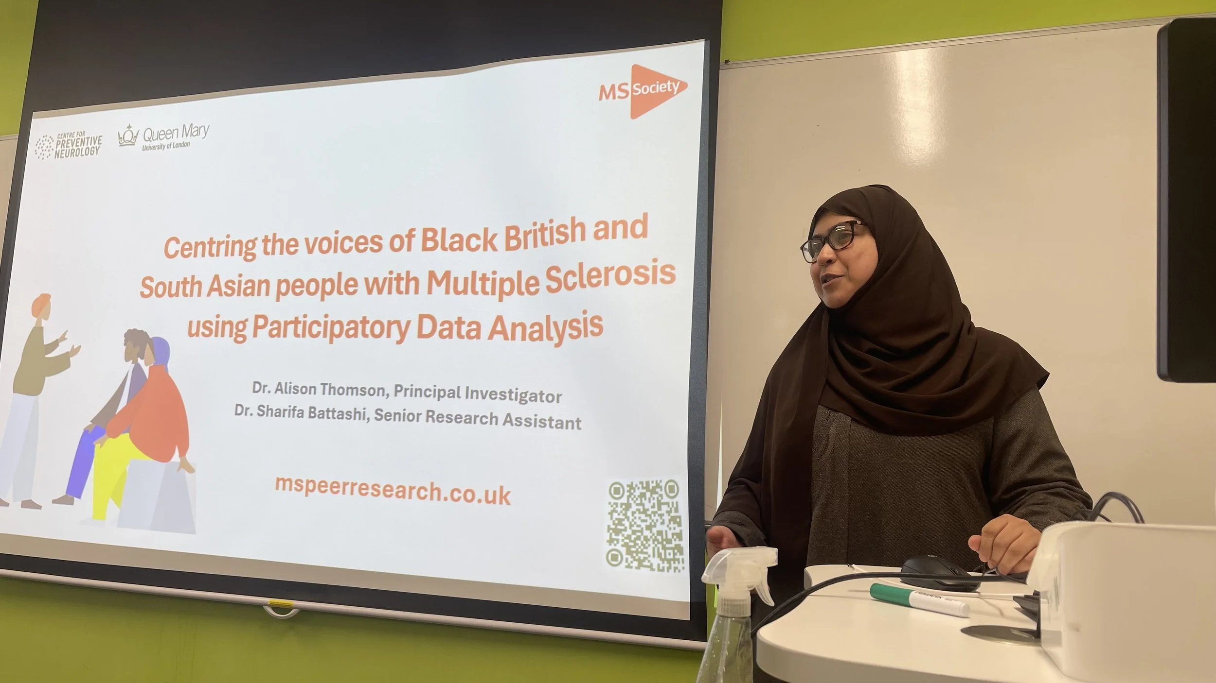 In this presentation, Sharifa talked about the approach the study team developed with the peer researchers to co-analyse the generated qualitative data from interviews and focus groups. The approach aimed to value lived experience as a form of expertise, shaping how findings were interpreted and grounded in the realities of life with MS. She shared reflections on how the participatory analysis process was designed and learnings from the process.